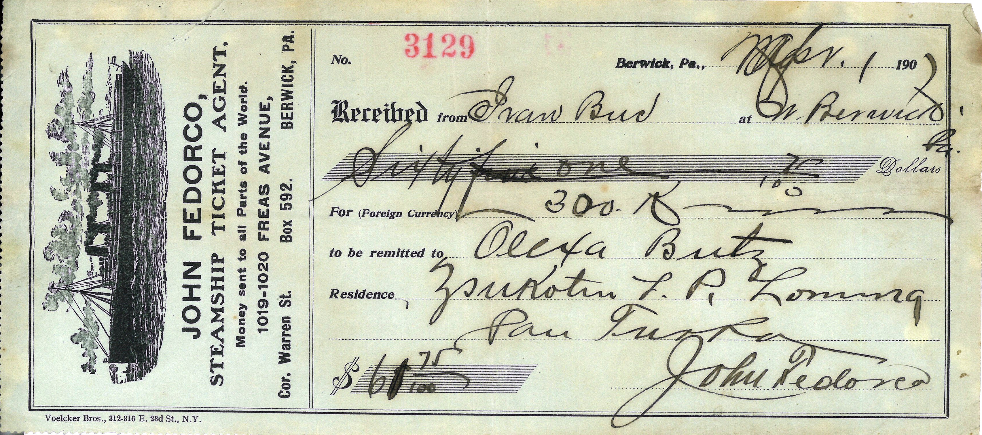 My grandfather Иван Будз by 1907 had apparently moved from the Scranton area to Berwick. I don't think there were international money orders then so sending money back home was done through steamship ticket agencies. Honestly I don't know how (and if) the money made it from the US to the recipient in Austria-Hungary since to me it seems the information isn't precise enough. But I have six of these "international money orders" sent over several years so it must have.